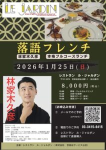 Information 林家木久彦の『落語フレンチ』 開催します【ご予約期間】12月2日(火)11:00~1月21日(水)18:00 ※定休日:月曜 (祝日の場合は翌日) 、12/29~1/3までお休み この度 本格フルコース&落語会を開催します。自慢の本格フレンチのフルコースと落語を同時に楽しめる特別なランチ会をご用意し ...続きを読む